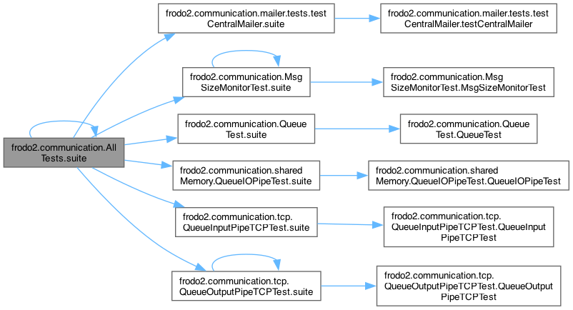 References suite(), frodo2.communication.mailer.tests.testCentralMailer.suite(), frodo2.communication.MsgSizeMonitorTest.suite(), frodo2.communication.QueueTest.suite(), frodo2.communication.sharedMemory.QueueIOPipeTest.suite(), frodo2.communication.tcp.QueueInputPipeTCPTest.suite(), and frodo2.communication.tcp.QueueOutputPipeTCPTest.suite().